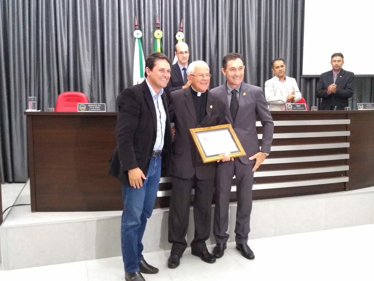 Por iniciativa do vereador Antônio Marques da Silva, o Marcos da Vila Reis e aprovada por unanimidade dos vereadores e vereadora, a Câmara Municipal de Apucarana entregou, na noite desta quinta-feira (20/02), a Moção de Aplausos ao Monsenhor Roberto Carrara.